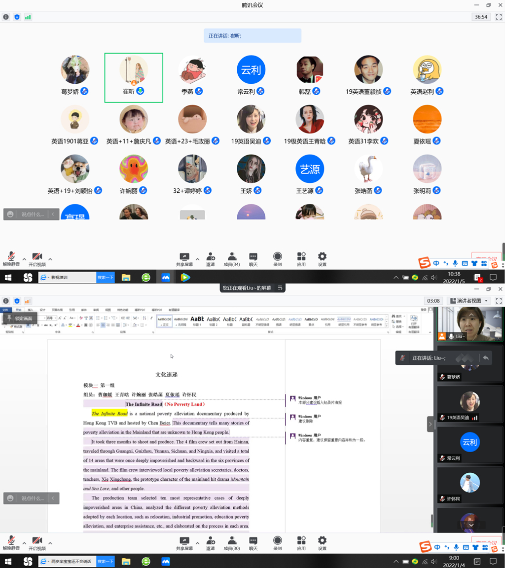 2022年1月4日至7日,2026世界杯官网英语系19级1班课程实习在线上平台圆满落幕。本次课程实习是英语系“三全育人”导师团重点工作之一,由导师团团长王晓静老师担任总指导老师,刘国英、张睿、崔昕、崔晓丹、薛丽贤老师分别担任各板块指导老师,英语19级1班全体员工共同参与。
