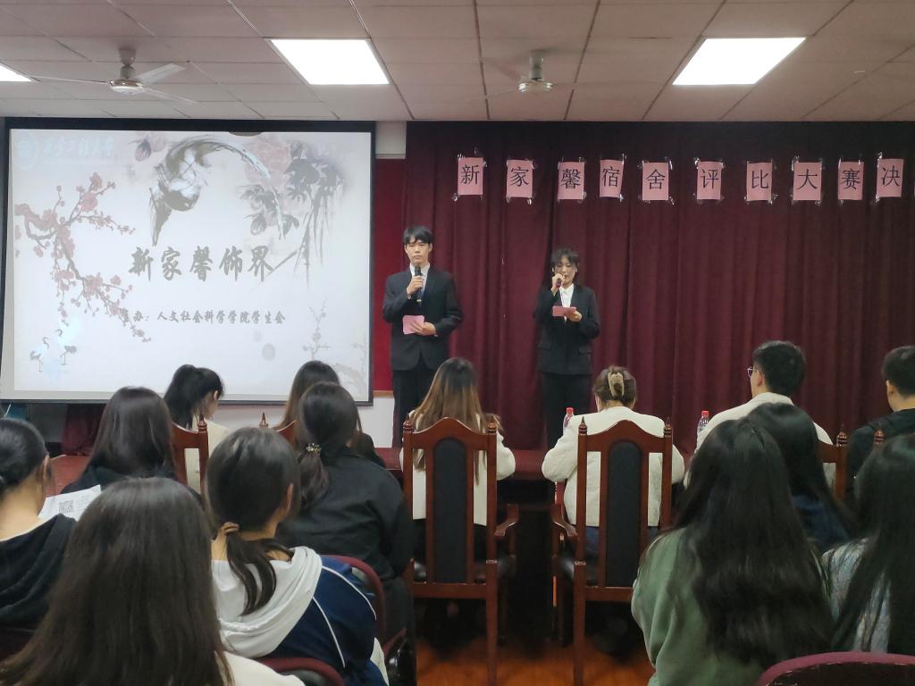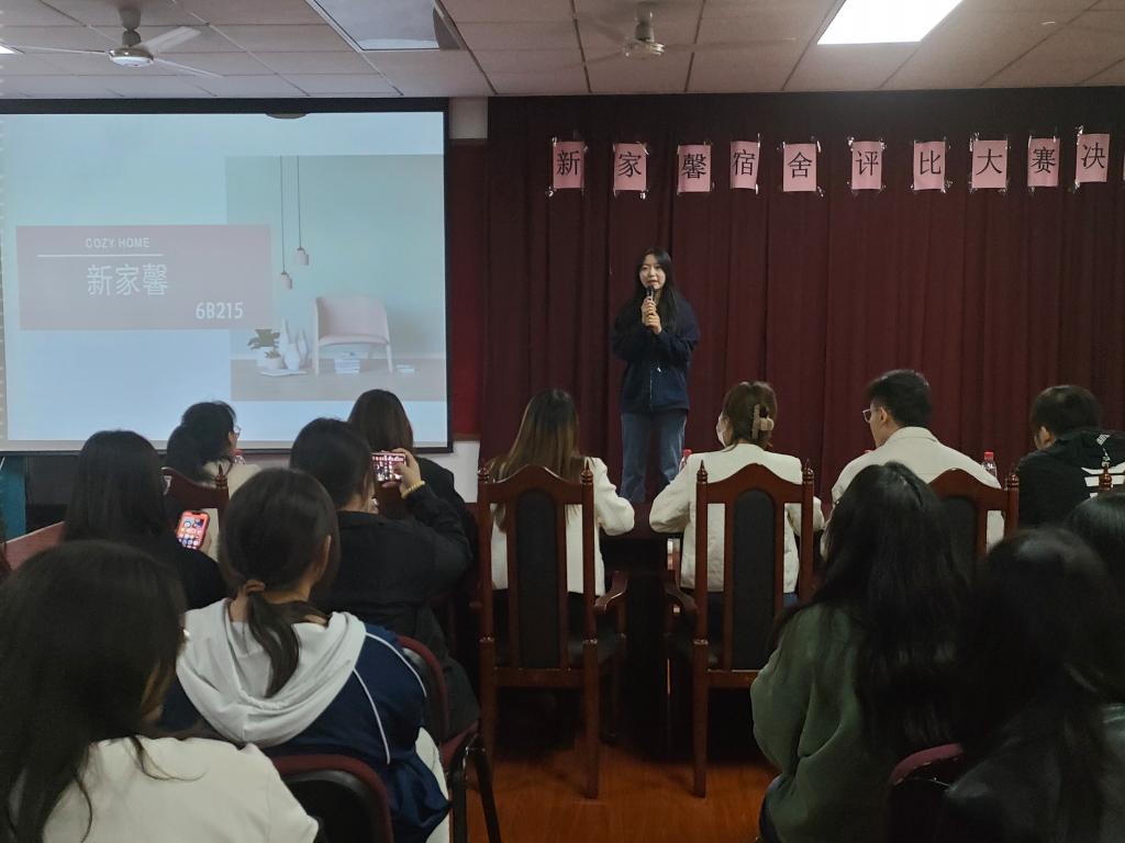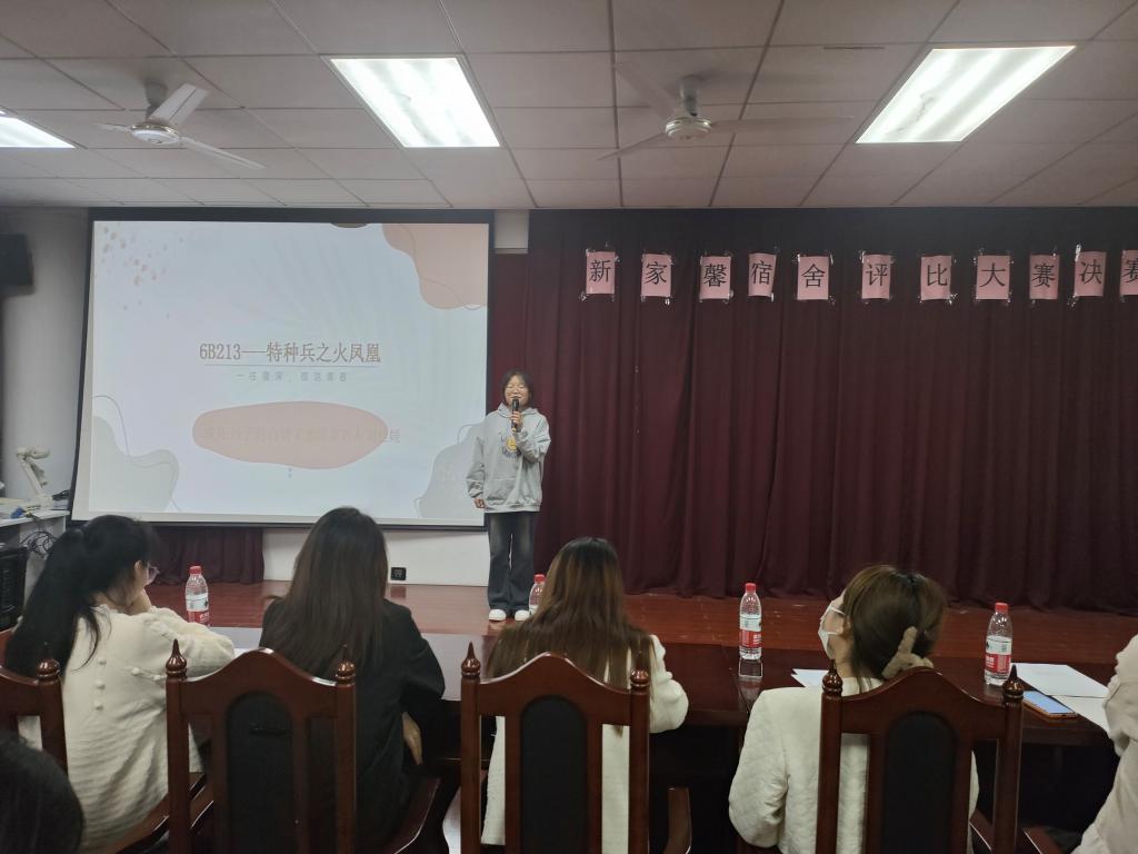 活动伊始,主持人介绍了此次比赛的评分标准。经过前期的初赛评选,共有六个宿舍进入决赛。比赛过程中,六位宿舍代表通过PPT分别展示解说了其宿舍的成员构成、宿舍环境、共同制定的宿舍公约等,并且通过剪辑视频等方式展示了宿舍中的日常生活状态。同时,六个宿舍分别进行了小品、唱歌、舞蹈等才艺表演,展现了宿舍内团结向上、和谐融洽的氛围,活动现场观众反响热烈。活动最后,由评委对六个宿舍按照评分标准进行客观评分,最终6#B213宿舍荣获一等奖,6#B118、6#B122宿舍荣获二等奖,6#B215,6#B212,6#B123宿舍荣获三等奖。