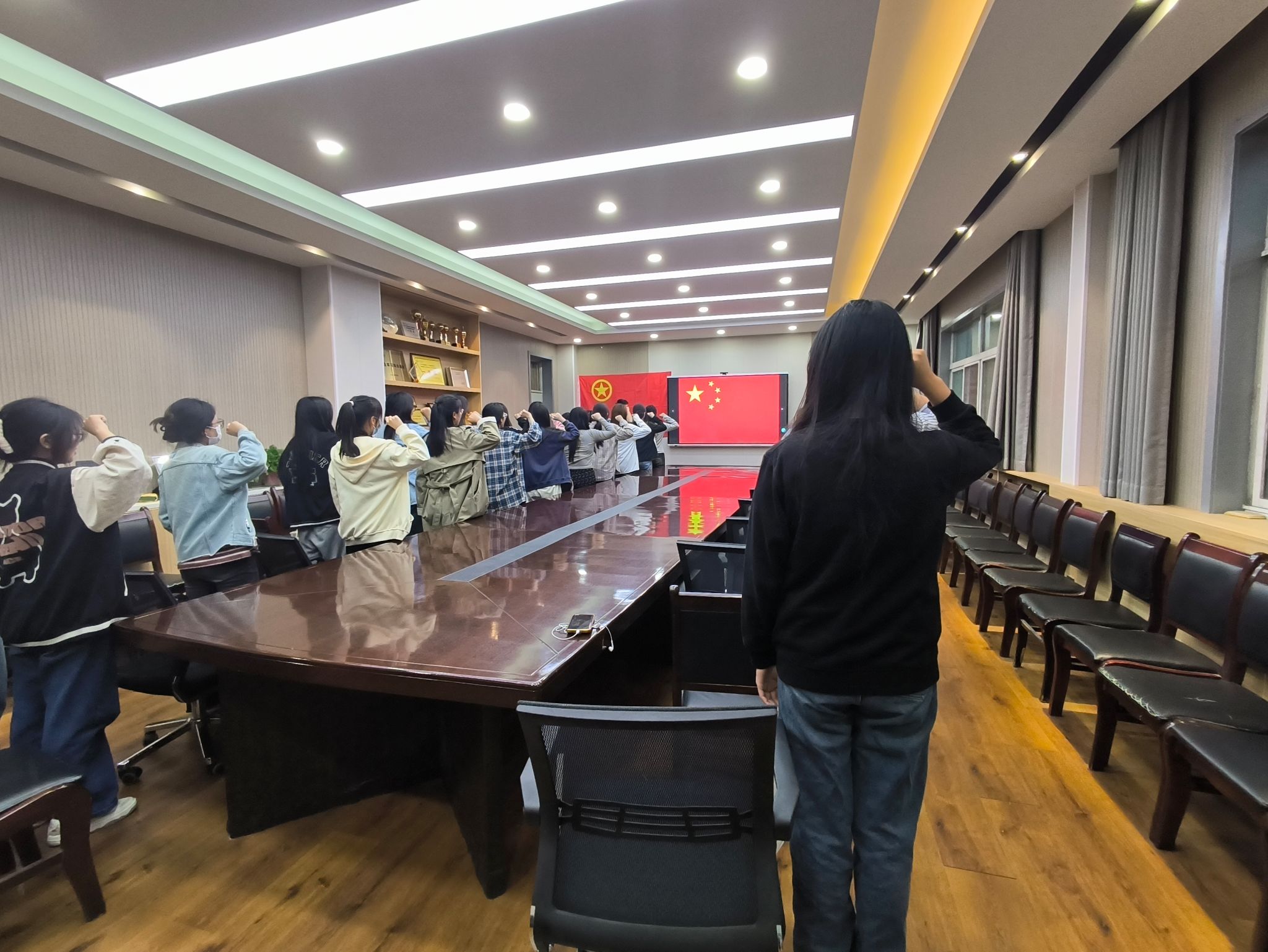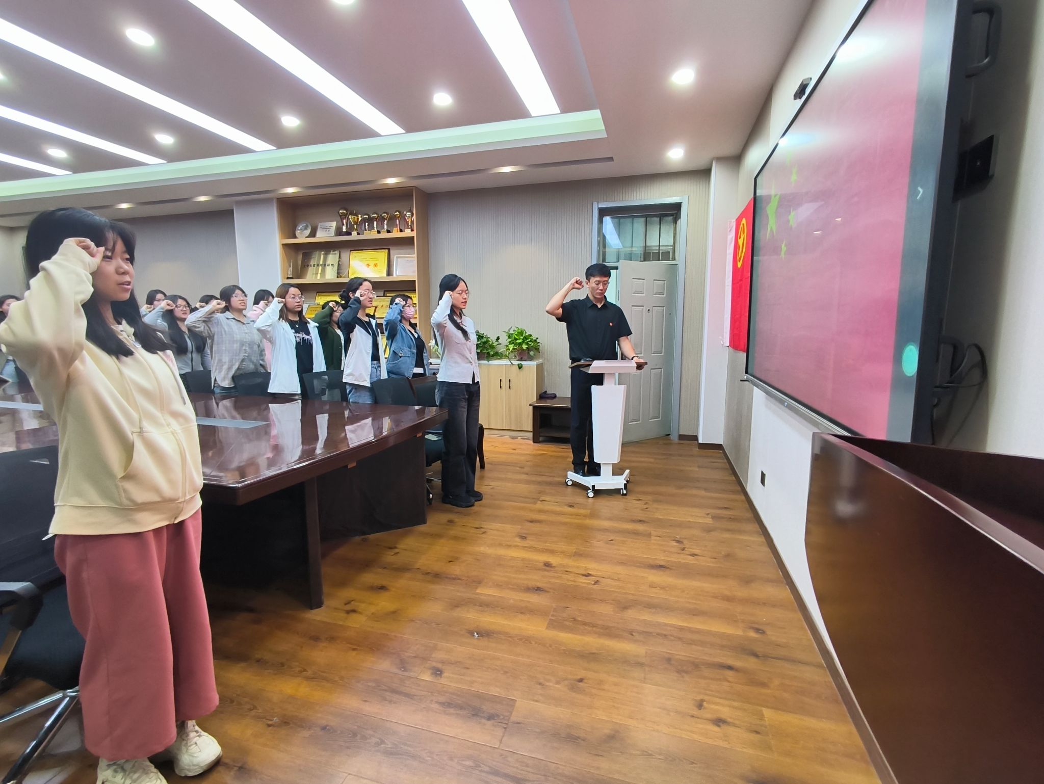 观影结束后,在鲜红的五星红旗与团旗之下,刘杨扬带领全体团员青年代表进行宣誓。铿锵有力的誓词将个人奋斗与国家发展紧密相连,铮铮誓言不仅是团员对国家的庄严承诺,更是对青春岁月的郑重宣誓,它激励着全体团员不忘初心,奋力拼搏,以一腔热血写出俯仰无愧于民族的报国华章。