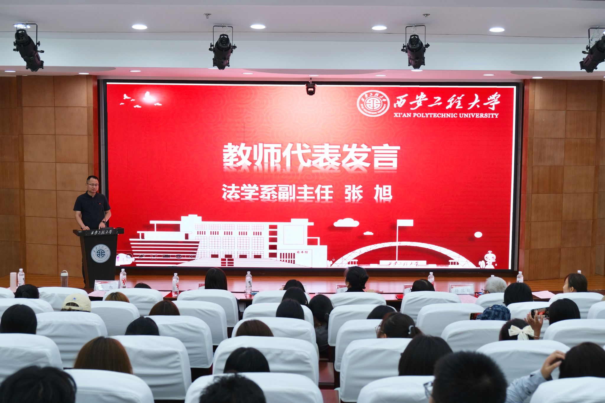 随后,法学系副主任张旭作为教师代表进行发言。他以“寻梦而追,不负此行”为主题,指出大学是人生旅程的新起点,希望同学们珍惜时光,树立生活上的自立意识、学习上的自主意识、行为上的独立意识,面对生活中的挫折要有韧性和韧劲,积极承担社会责任与义务,并希望同学们在大学中积极进取,有所收获。