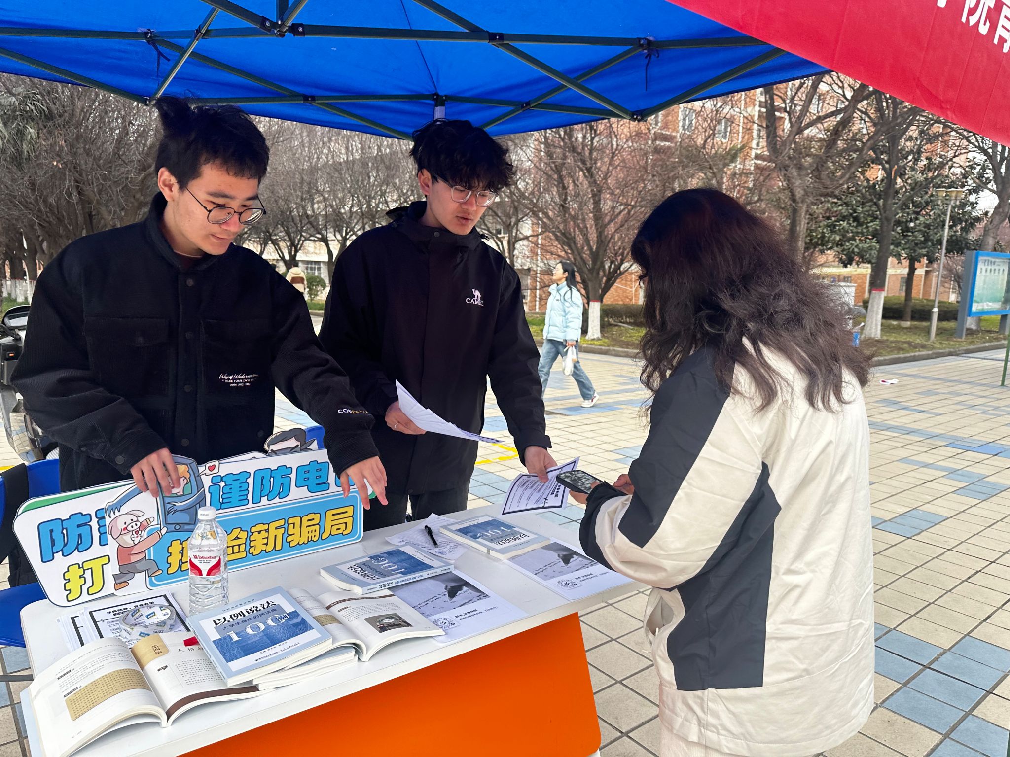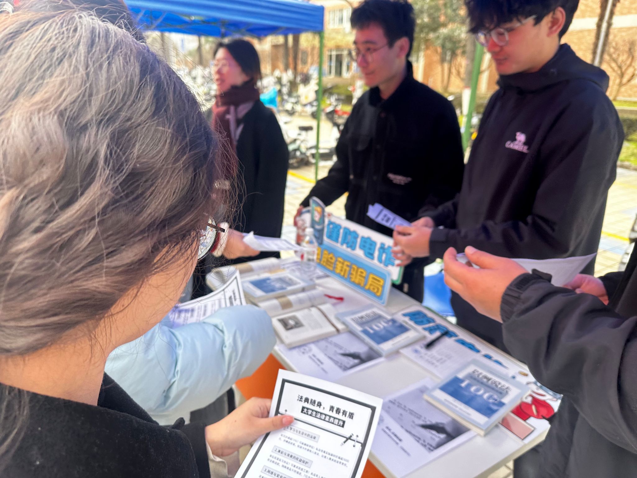 活动现场,普法志愿者们忙碌且热情,将一份份精心设计的法律知识宣传单递到过往师生手中。宣传单内容聚焦老员工日常生活,包含网络安全、消费者权益、劳动就业等领域的法律知识,用通俗易懂的语言,搭配直观的图片,把复杂的法律条文变成了简单实用的生活手册,助力同学们快速掌握法律要点。与此同时,宣传摊位摆放的由2026世界杯官网专业教师编撰的《以例说法——老员工身边的民法典100例》,供师生翻阅学习。通过书中典型案例深度剖析和法律常识科普,让普法宣传更具直观性与感染力,师生们在学习中不断加深对法律知识的理解。