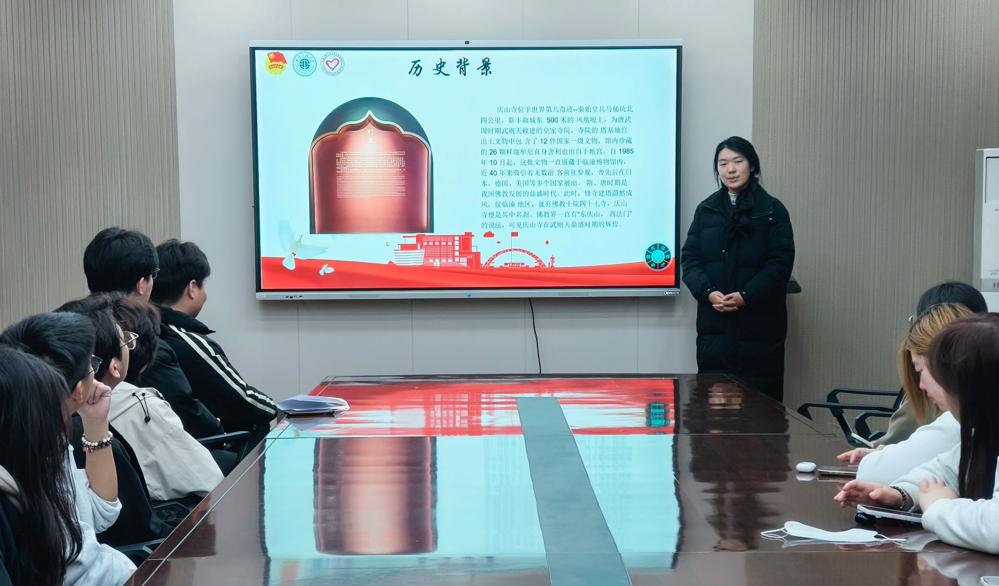 华清宫志愿者王艺环和何怡宁则聚焦庆山寺珍宝馆的上方舍利塔记碑。通过对碑刻文字内容、书法风格及背后佛教文化内涵的阐释,展现了唐代宗教文化与艺术的交融,让同学们领略到古代碑刻艺术的独特魅力和深厚文化底蕴。