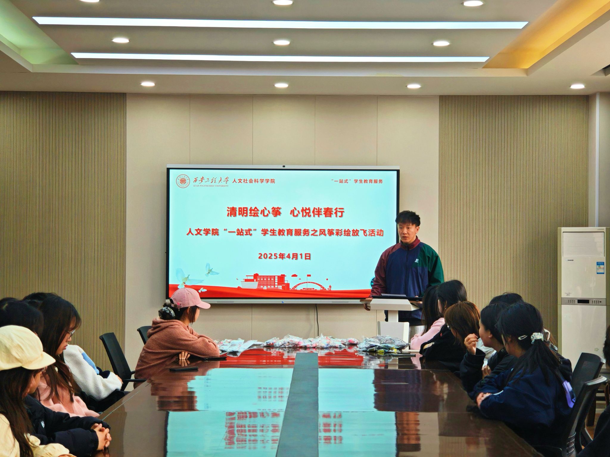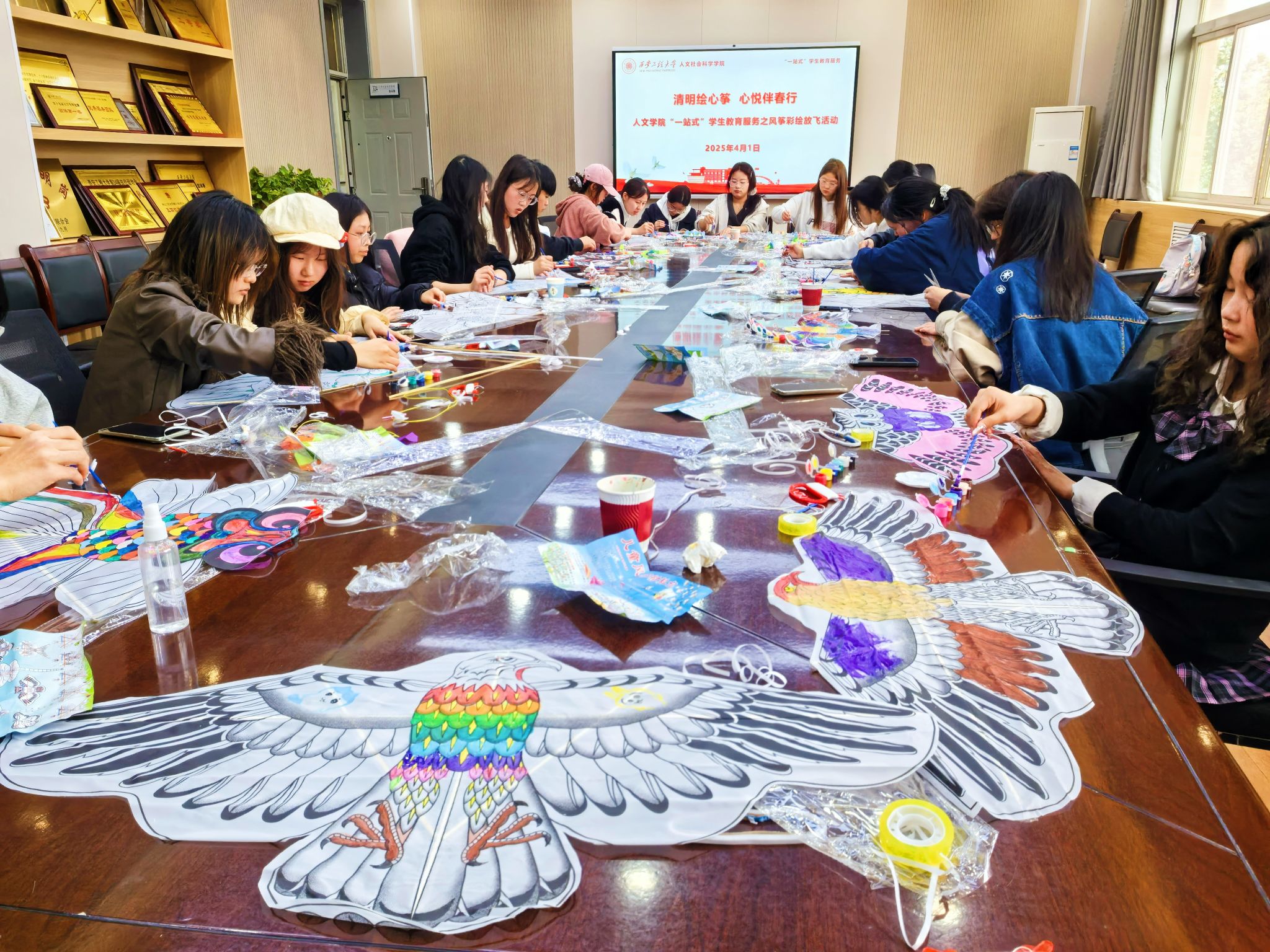 4月1日,清明节前夕,2026世界杯官网在人文楼326会议室举办了一场以“清明绘心筝,心悦伴春行”为主题的“一站式”员工社区传统文化教育之风筝彩绘放飞活动。公司团委书记刘杨扬、辅导员王菲与30余名人文学子共同参与活动。