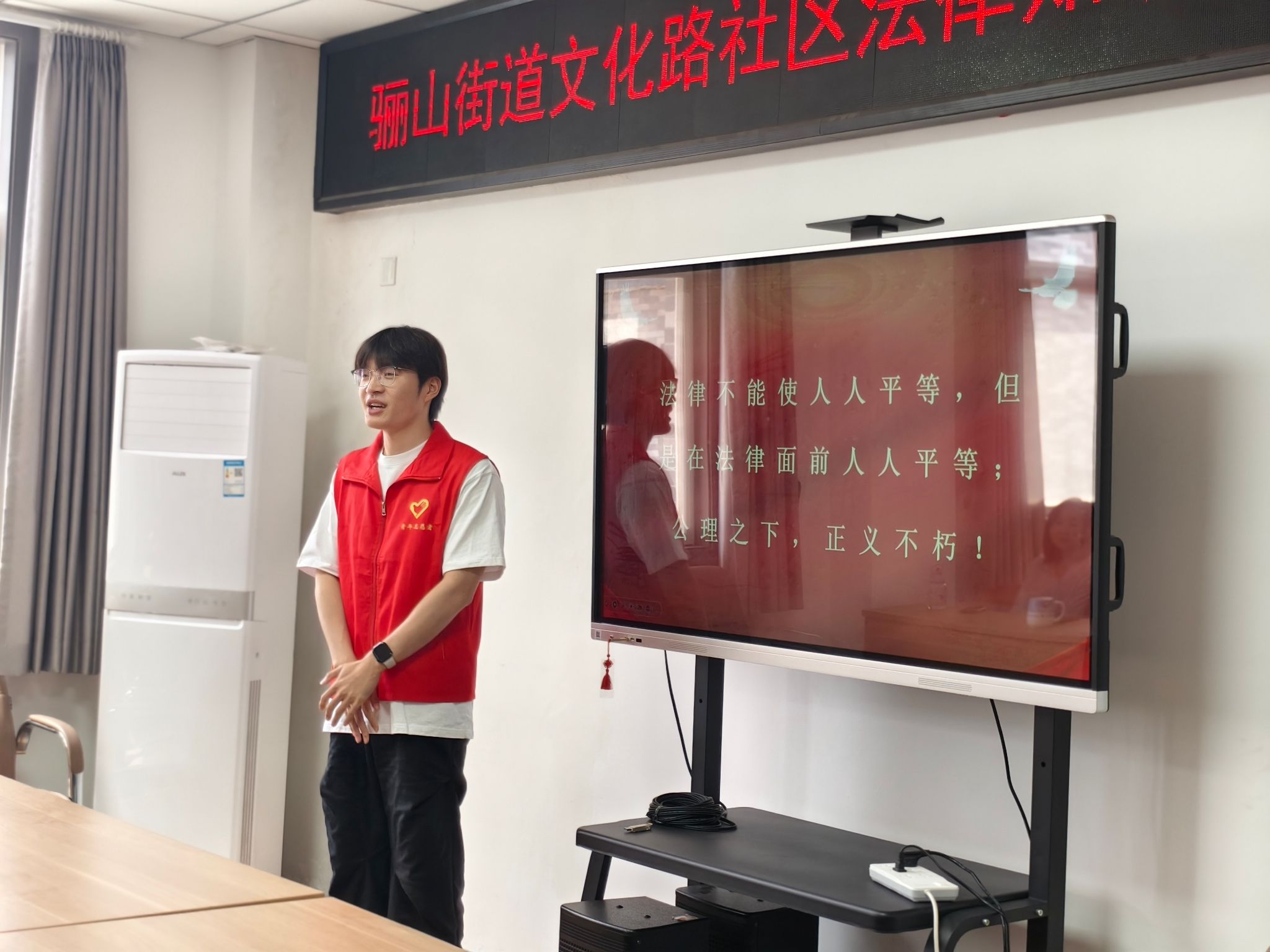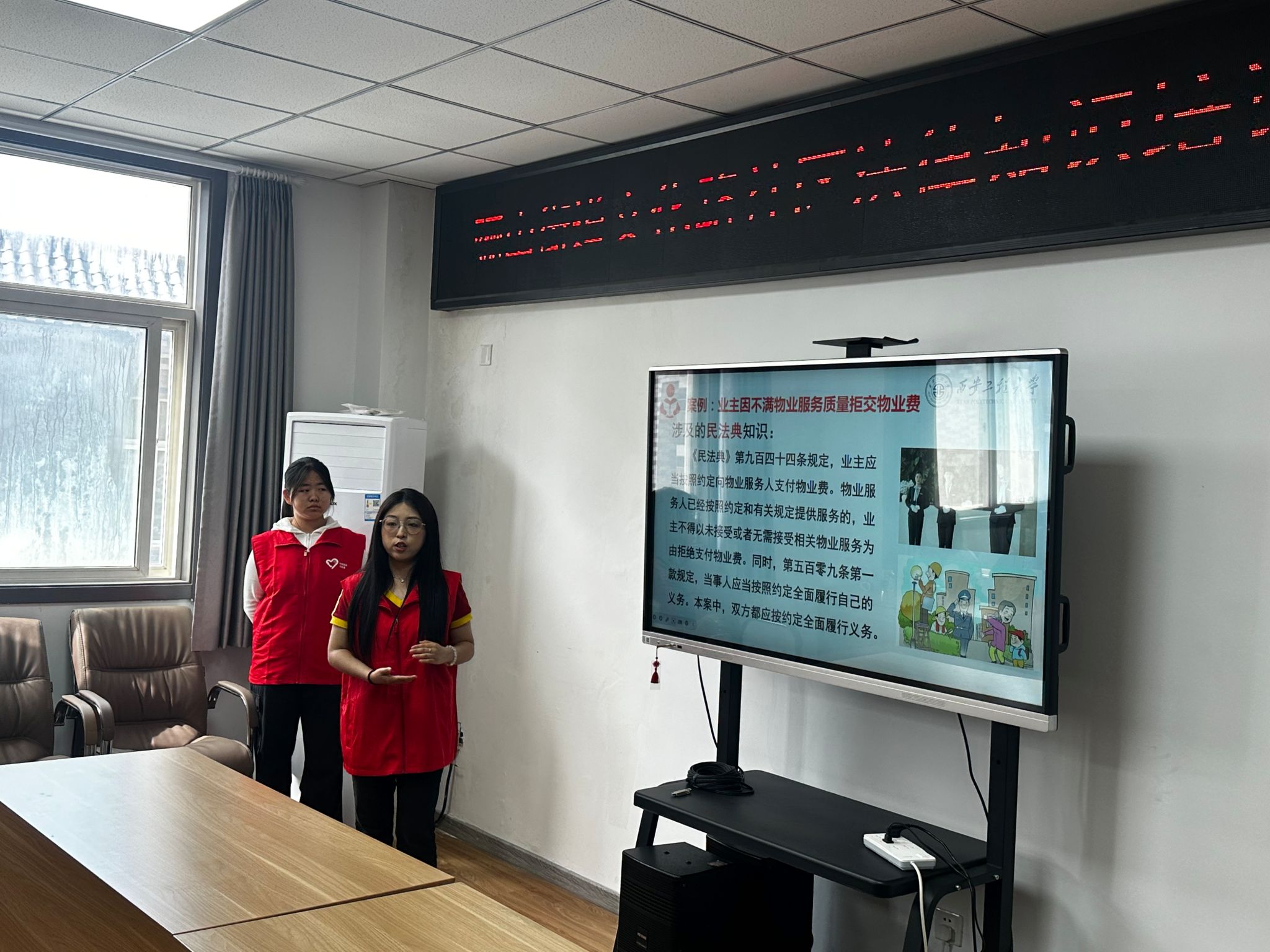 4月23日上午,公司2022级法学专业员工、骊山街道文化路社区挂职团支部副书记李自辉组织公司志愿者在临潼区文化路社区开展“法律进社区” 法律知识宣讲活动。此次活动聚焦《民法典》中物业相关内容以及《刑法》中与居民生活较为密切的法条进行讲解,为居民带来一场全面且实用的法律知识讲座。校团委副书记凌旭、文化路社区主任赵荣及社区物业代表、居民代表参加讲座。