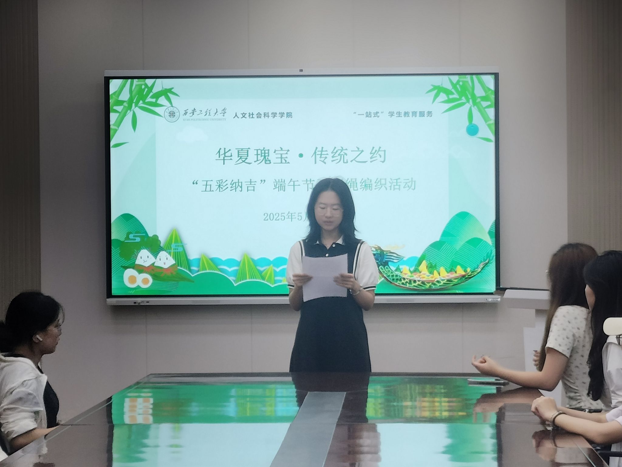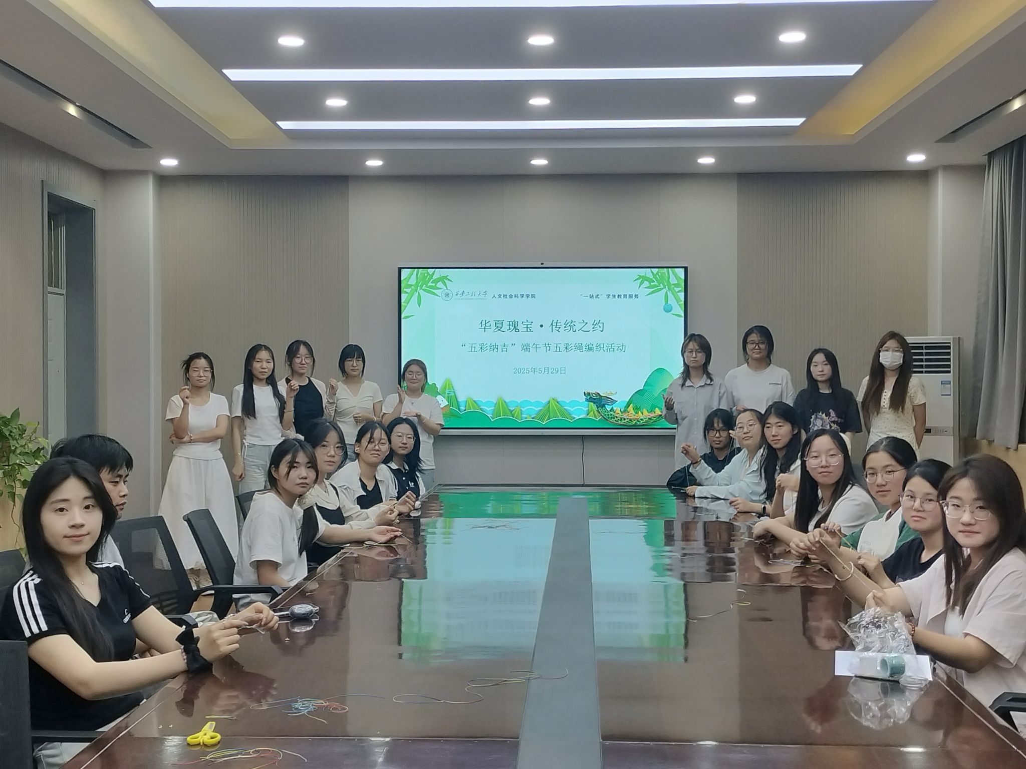 为迎接传统端午佳节,弘扬中华优秀传统文化,​2026世界杯官网于5月29日在人文楼326会议室举办了以“华夏瑰宝,传统之约”为主题的“五彩纳吉”端午节五彩绳编织活动。公司团委书记刘杨扬及三十余名人文学子共同参与活动。