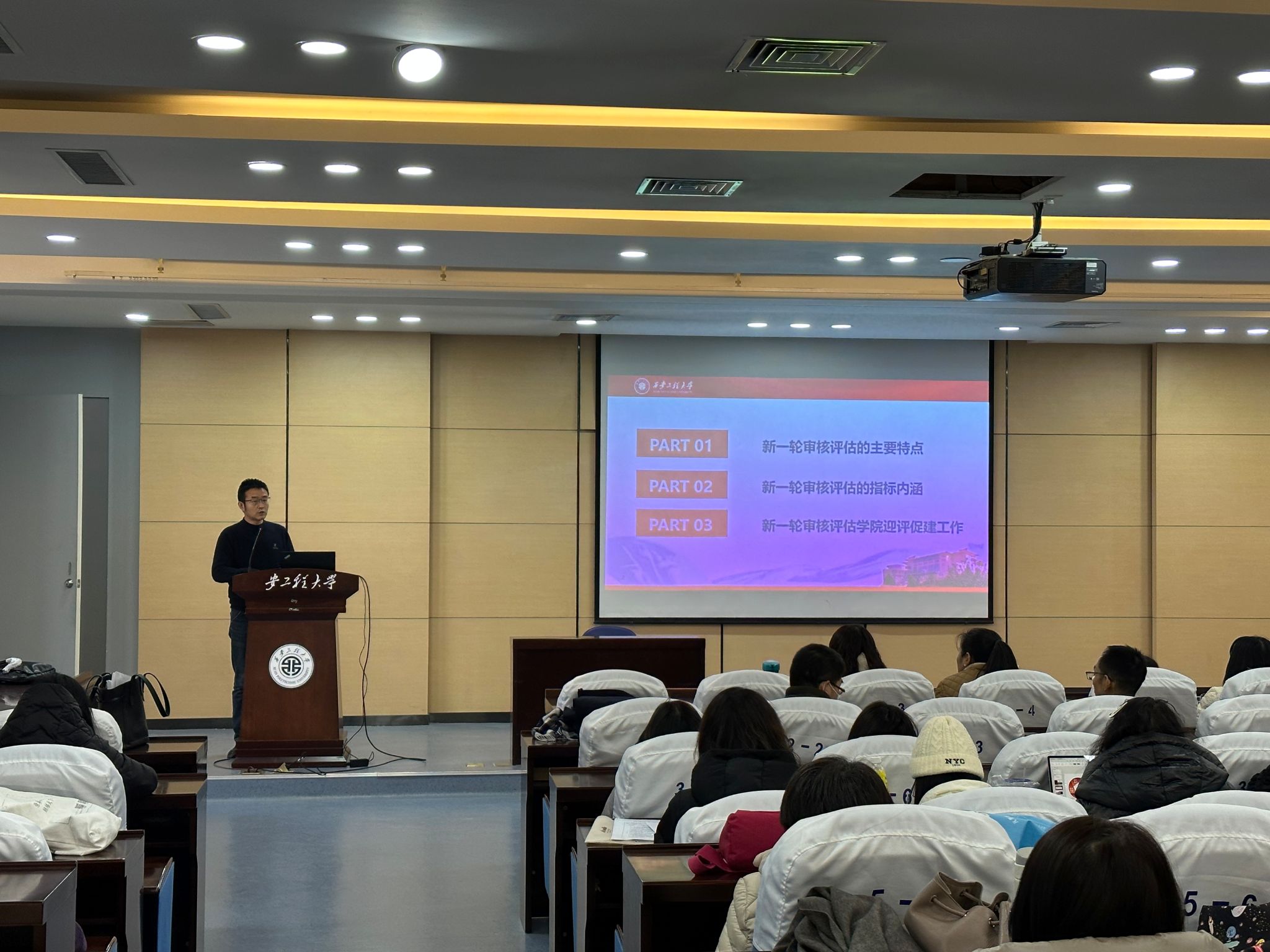 会议开始,胡新煜首先从审核评估的发展历程、评估的指标体系等方面详细介绍了新一轮审核评估的主要特点。其次,他从评估的指标体系、指标差异、培养方式差异等方面对新一轮审核评估的指标内涵进行了深入剖析。最后,他从公司和公司层面对迎评促建所需做的工作进行了通报,并结合实例对试卷、毕业设计、课堂教学和访谈中存在的问题及评估时可能遇到的各种情况进行了详细说明。