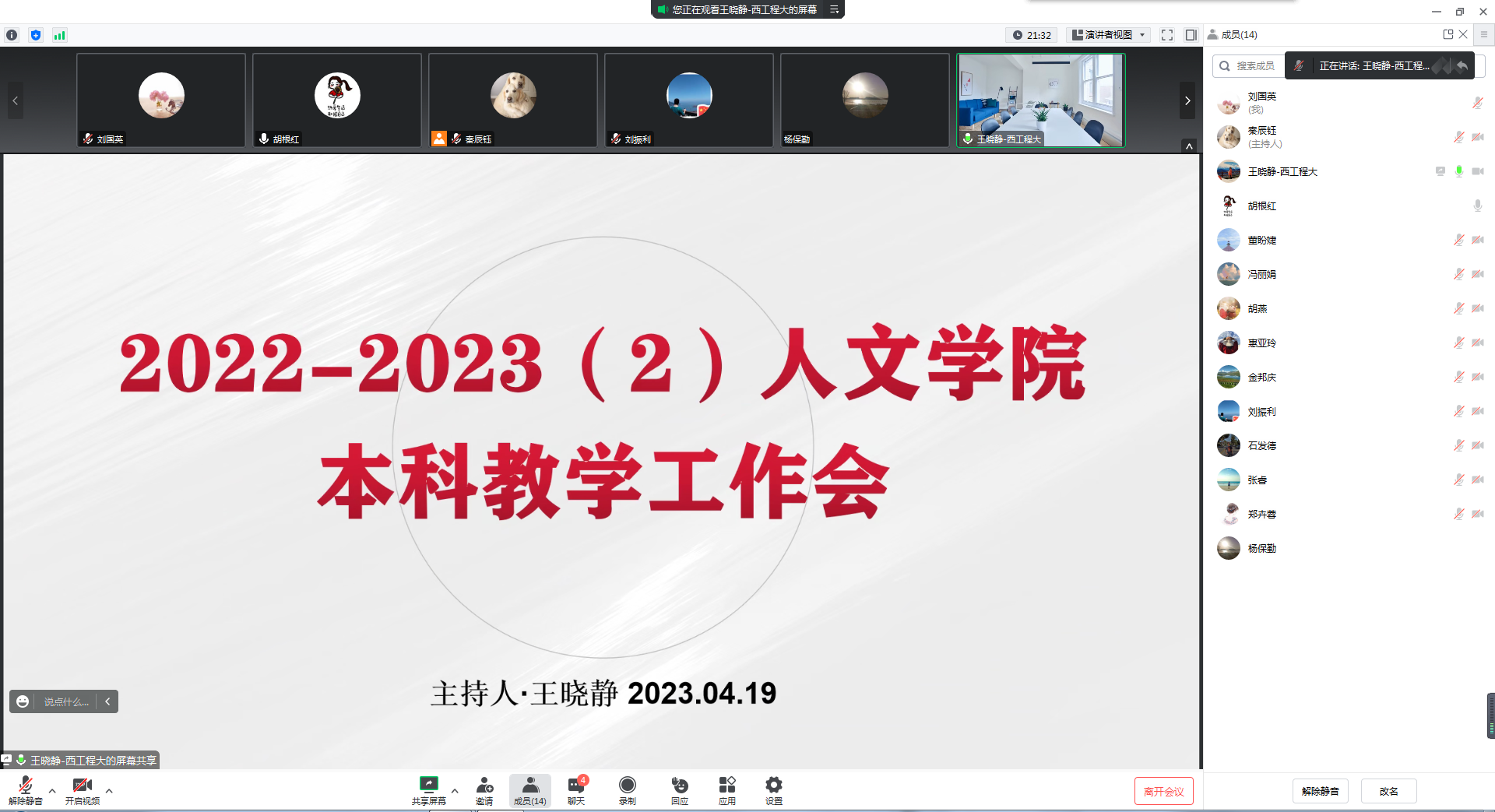 4月19日中午,公司在线上召开了2022-2023春季学期本科期中教学工作会。副经理王晓静、各系部主任、副主任及教务员秦辰钰参加本次会议,会议由王晓静主持。