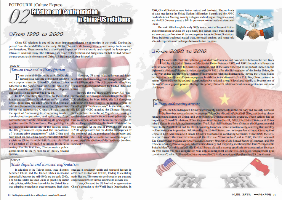 《POTPOURRI》第十三期在以往的基础上不断改进,充实内容,创新形式,共设置名家名作、文化速递、娱乐氧吧、翻译园地、写作园地以及毕业季六大版块。前五大版块紧扣德育美育、思政教育和文化自信主题,内容涵盖名著《月亮与六便士》的解读,中美外交关系的历程与未来合作展望,第十九届杭州亚运会的介绍,纺织服装类翻译与口笔译名家的访谈,以及讲好中国故事、传播中国声音等专题。毕业季板块则收集整理了2020级毕业生的精彩瞬间和部分优秀员工风采展示,作为送给毕业生的特别礼物。