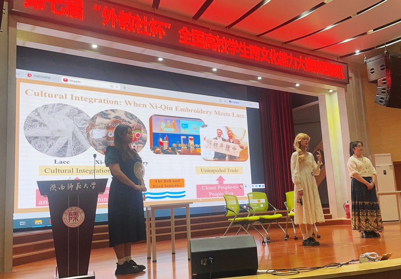 在复赛中,团队成员结合校本特色,选取“西秦刺绣与蕾丝”为跨文化冲突案例,以生动的语言和靓丽的扮相,对其中的跨文化情境进行了演绎,同时深入分析了其中所蕴含的跨文化知识和理论,最后对评委的提问进行了深入剖析和解答,最终取得三等奖的好成绩。