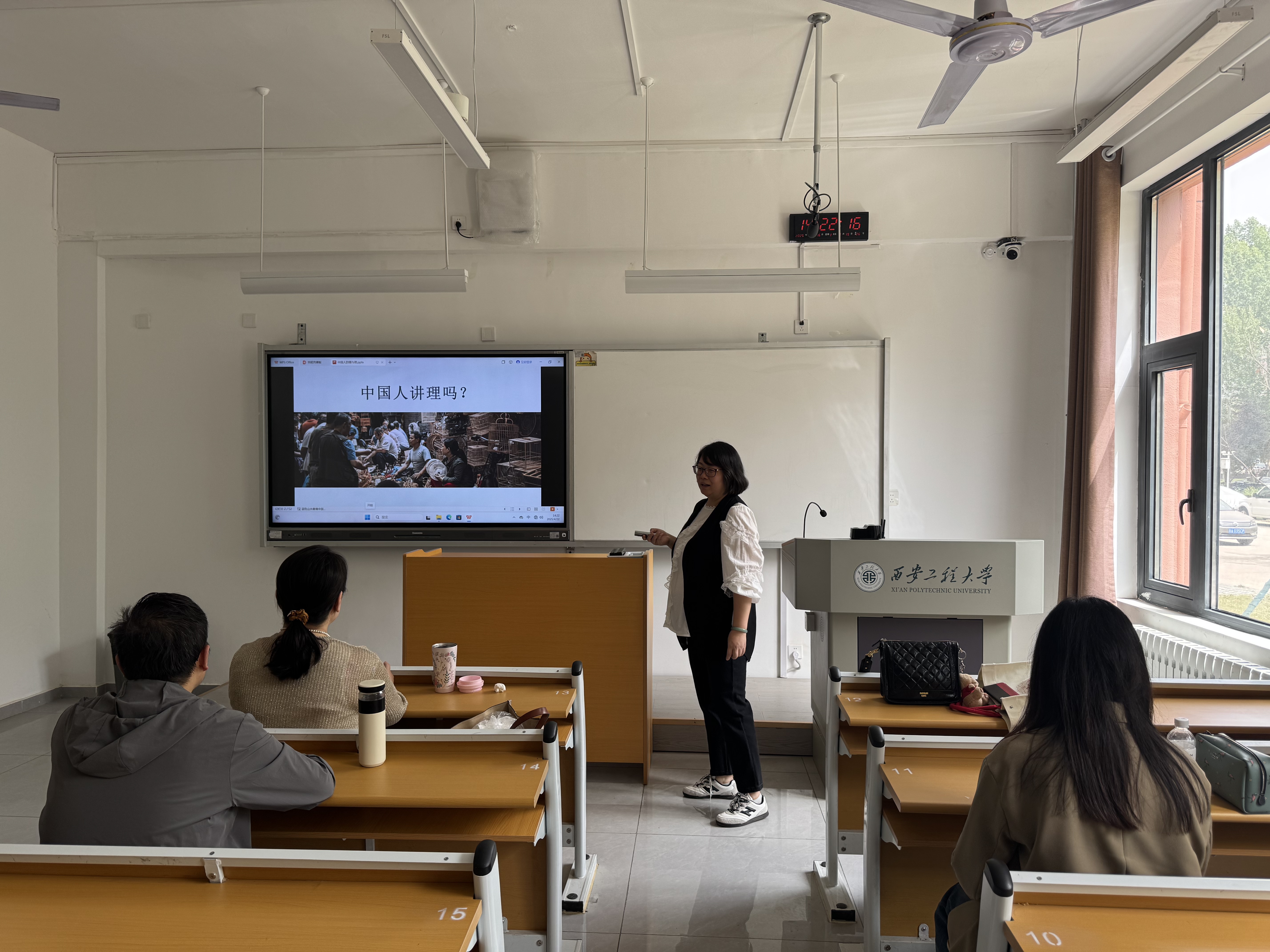 赵莎莎老师以《中国人的情与理》为题,为大家呈现了一堂生动有趣的中国传统文化课程。课堂上,赵老师凭借扎实的专业知识和丰富的教学经验,深入浅出地讲解了中国传统文化中“情”与“理”的内涵与外延。她从古代典籍与经典故事入手,结合现代社会生活实例,引导大家理解中国人在处理人际关系、社会事务时所遵循的情理原则。赵老师还巧妙地运用多媒体教学手段,展示了一系列与主题相关的社会热点新闻、名师课堂视频,极大地丰富了课堂内容。