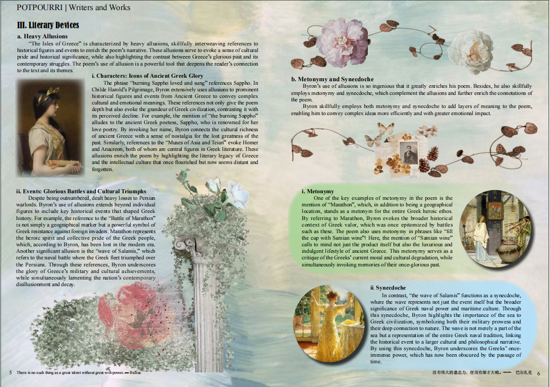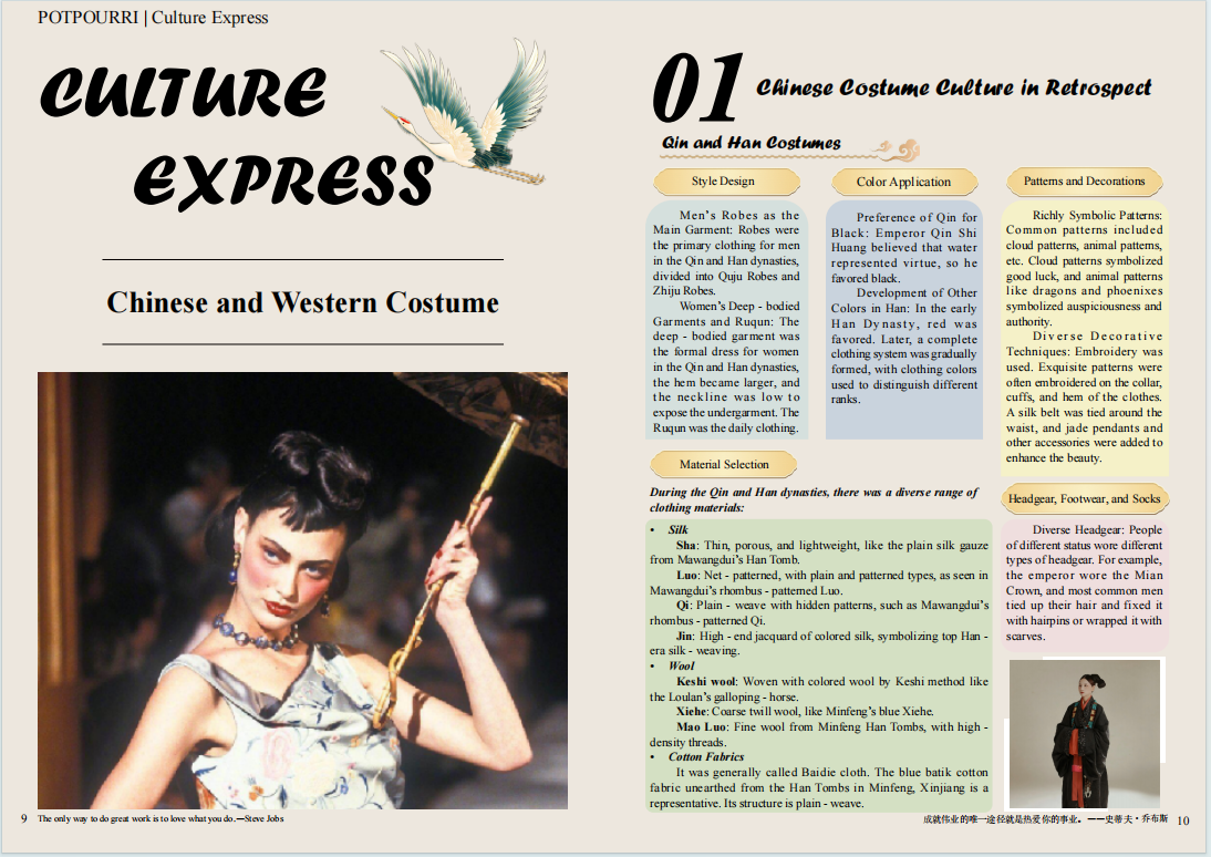 本期内容紧密围绕“三全育人”理念,着力提升思政教育实效与文化自信。“名家名作”版块带领读者赏析拜伦的经典著作《唐璜》;“文化速递”版块探讨中西方服饰文化的异同;“娱乐氧吧”版块则聚焦巴黎奥运会动态;“翻译园地”既介绍了国内外知名纺织公司,也展示了杰出口笔译家的风采;“写作园地”精心呈现了英语系学子的优秀文章。这五大核心版块巧妙融合本校纺织专业特色与英语专业技能,引导读者在获取知识的过程中增强文化认同感与爱国主义情怀,提升讲好中国故事的能力。五大版块相辅相成,共同构建了融专业学习与价值引领于一体的阅读平台