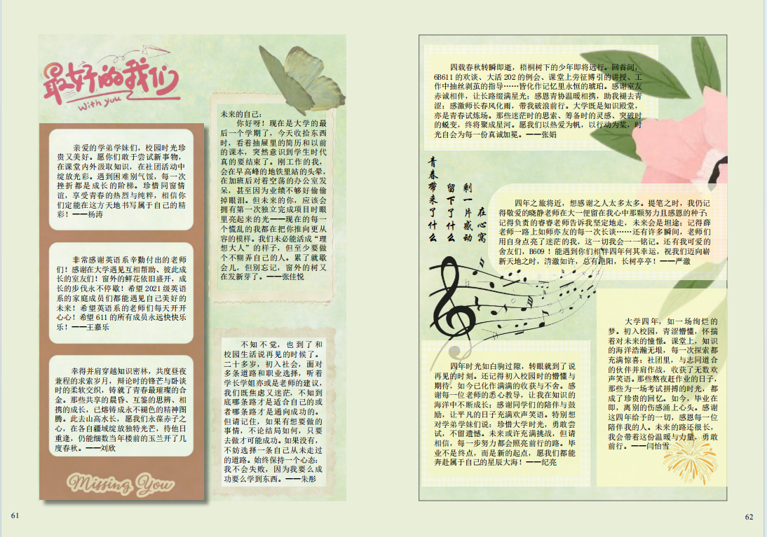 此外,本期新增了“留言板”版块,收录了2021级英语专业毕业生的真挚感言。留言内容丰富多彩,既有依依惜别的临别寄语,也有对恩师同窗的深情回忆;既有对大学四年生活的点滴感悟,也有对未来的憧憬与期许;还不乏对学弟学妹的真诚赠言。这些发自肺腑的文字为毕业季增添了浓厚的温情与传承色彩。