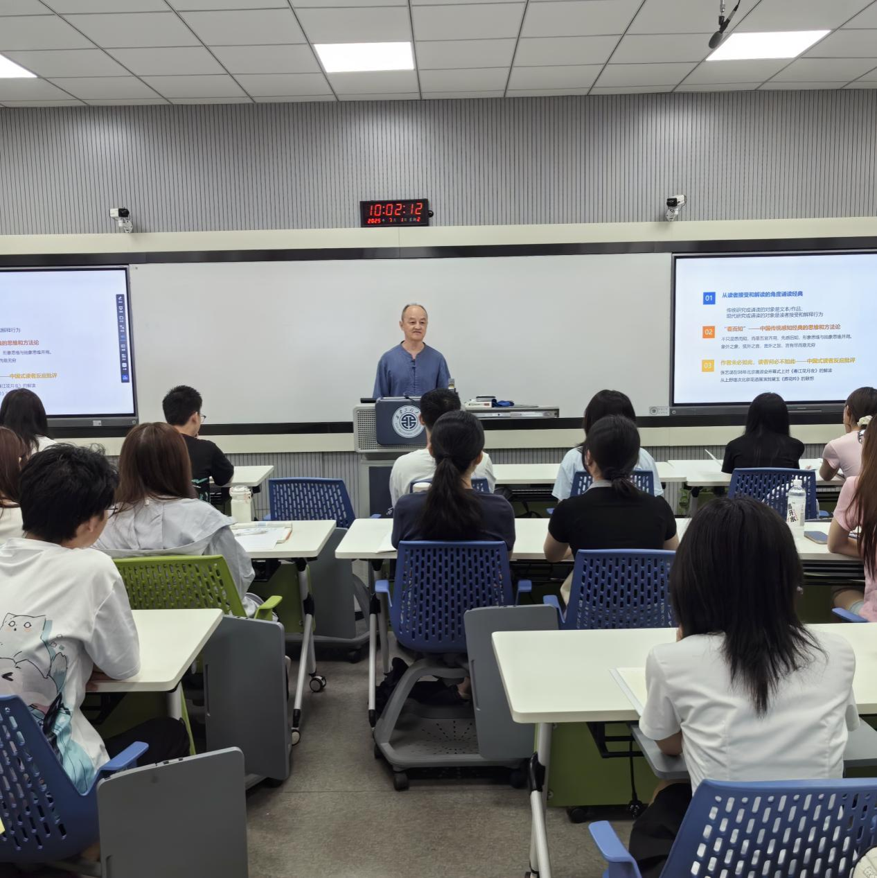 何依工教授围绕“读者接受和解读角度诵读经典”“看而知——中国传统感知经典的思维和方法论”“作者未必如此,读者何必不如此——中国式读者反映批评(接受的角度)”三方面,搭建唐诗解读理论框架。他以李白《将进酒》为例,说明理解经典要兼顾“读者接受度”与“时代语境”,突破时空和作者局限,让读者与千年前创作者“对话”。论及感知经典的思维和方法论,何老师结合王维、张若虚作品,阐释“寄托”与“意象营造”,如王维《过香积寺》借自然意象传禅意,张若虚《春江花月夜》融个人情思与宇宙观。针对英语专业员工,何老师特地强调“跨文化传播视角”,以“草枯鹰眼疾,雪尽马蹄轻”等为例,分析意象英文表达,鼓励挖掘与西方文学共鸣点,让经典跨语言壁垒。