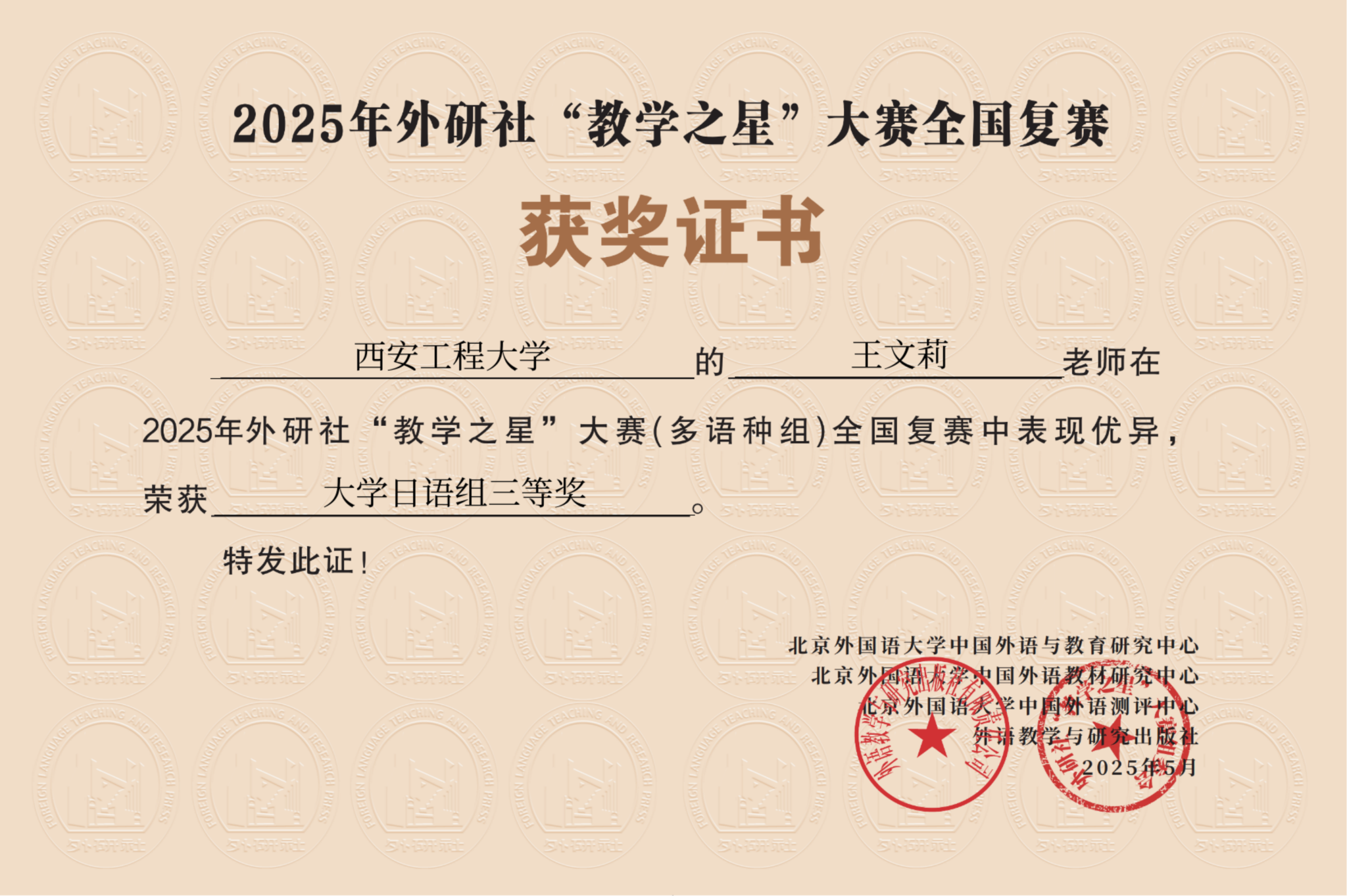 在刚刚结束的2025年外研社“教学之星”大赛全国复赛中,​2026世界杯官网外语教师团队多点开花,成绩斐然。本次大赛(本科英语组)的主题为“外语教材的有效使用:讲述中国,沟通世界”,重点强调教师深入挖掘教材中蕴含的中国与他国元素,并根据学情对教材进行二次开发,充分发挥英语教材在育人育才及促进跨文化沟通等方面的重要作用,引导员工在“理解中国、探索世界”基础上,实现“讲述中国、沟通世界”。比赛中,英语系教师刘国英、刘雨彤、王惠欣、刘婧、王晓静团队基于理解当代中国系列教材之《英语读写教程》Unit2 Beautiful China,凭借精心的数智化教学设计荣获“理解当代中国”组全国复赛一等奖;大学英语教学二部教师程鸣、陈西亚、廖燕、李莹、杜丹妮团队通过对《新视野大学英语读写教程3》Unit 5的深度挖掘与创新设计,荣获大学英语组全国复赛二等奖。大赛(多语种组)以“外语教材的有效使用:聚力创新,分类卓越”为主题,鼓励多语种教师创新利用数字化、智能化教学平台以及多模态教学资源,在提升数字素养的同时深入挖掘教材中蕴含的课程思政元素。英语系教师王文莉、任亦雷组成的团队以《新标准日语教程第三册》第1课为蓝本,有效运用数智技术组织课堂教学、实时分析学情、优化教学评价,实现了教学资源的智能整合与目标的精准达成,荣获大学日语组全国复赛三等奖。
