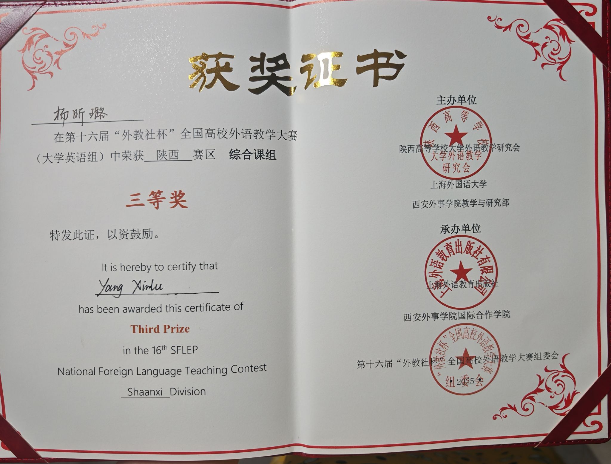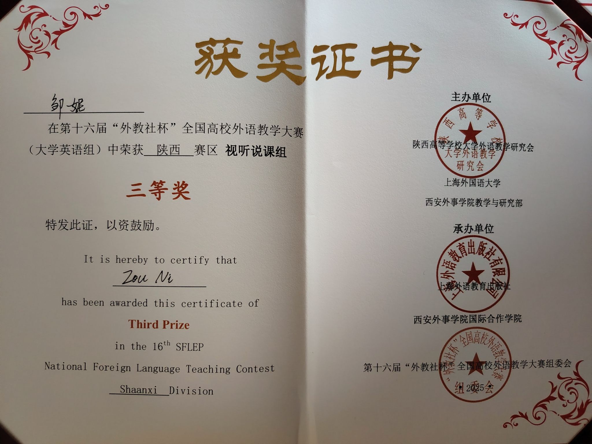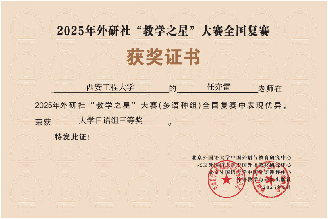 同时,在第十六届“外教社杯”全国高校外语教学大赛(大学英语组)陕西赛区赛事中,公司教师再创佳绩:杨昕璐老师荣获综合组三等奖,邹妮老师荣获视听说组三等奖。该赛事以“传播中国领航未来”为核心理念,旨在探索课程育人新范式,推动高素质外语教师队伍建设。两位老师的获奖,再次印证了公司教师在探索教学创新、提升育人实效方面的扎实努力。