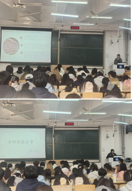 陈晓文、隋静雯、霍若木从备赛节奏、题型突破、实战心态等维度,拆解了国才比赛不同类别的备考技巧;陈晓文、瞿福榕分析了参赛流程和规则,结合参赛案例,讲解了学科竞赛的选题策略与团队协作要点,同时分享了她们参赛时的过程和经验,鼓励同学们树立良好的心态并积极践行;邓雯等同学围绕专四考试的题型分布,时间安排,题型,分阶段复习以及如何克服焦虑心态方面做了详细的讲解;张晓瑜则详细介绍了大创项目的方针政策,研究方法,人员构成,以及梳理了大创项目的申报流程、选题方向与材料准备细节。分享会聚焦“实用干货”,高年级学姐倾囊相授,用亲身经历驱散低年级同学的迷茫与困惑,用成长成果点燃大家的奋进热情——他们不仅分享具体技巧,更传递着“抱团成长、薪火相传”的温暖力量,让低年级同学在明确努力方向的同时,感受到专业集体的支持与关怀,更坚定了深耕专业、勇于探索的信心。