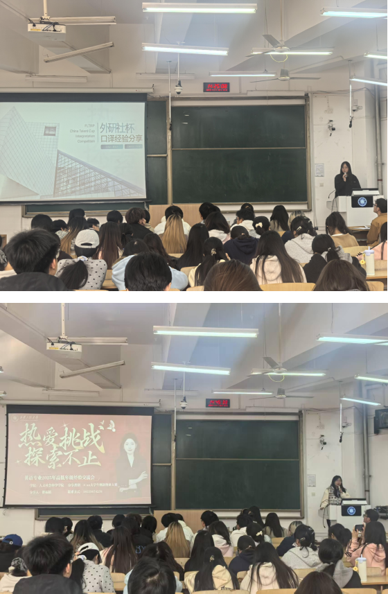 交流会邀请了在学科竞赛、专四备考及科创项目中表现突出的高年级员工代表:“外研社国才杯大赛”获奖同学陈晓文(省级笔译金奖、综合银奖)、隋静雯(省级综合银奖)、霍若木(省级口译铜奖),“外教社跨文化大赛”获奖同学陈晓文(省级金奖)、“iCan大赛”获得者瞿福榕(省级金奖),专四考试优秀员工邓雯、杨方妍、王悦,以及国家级大创项目负责人张晓瑜,为低年级同学分享实用经验。