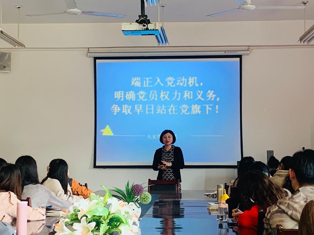 首先,郭欣欣从新时代背景下,承担新的历史使命出发引入“动机”的概念,结合案例分析,向同学们阐明了正确的入党动机以及如何以实际行动向党组织靠拢,使同学们更加明确自己的责任和义务,从小事做起,树立踏实肯干的工作作风,早日成为一名合格的中共党员。徐利兰带领同学们重温辉煌党史,从党的诞生背景、条件入手,内容丰富、详略有别地叙述了中国共产党历史上发生的重大事件,关键人物和政策路线的发展变化等。她希望同学们牢记这段历史,珍惜当下、勇于担当,为祖国的复兴贡献自己的力量。最后,金邦庆从学习贯彻落实“两学一做”出发,理清了党章与宪法的关系,剖析了新党章中修正的内容和具体条例,让同学们对新的党章党规有了更加全面和深刻的认识。