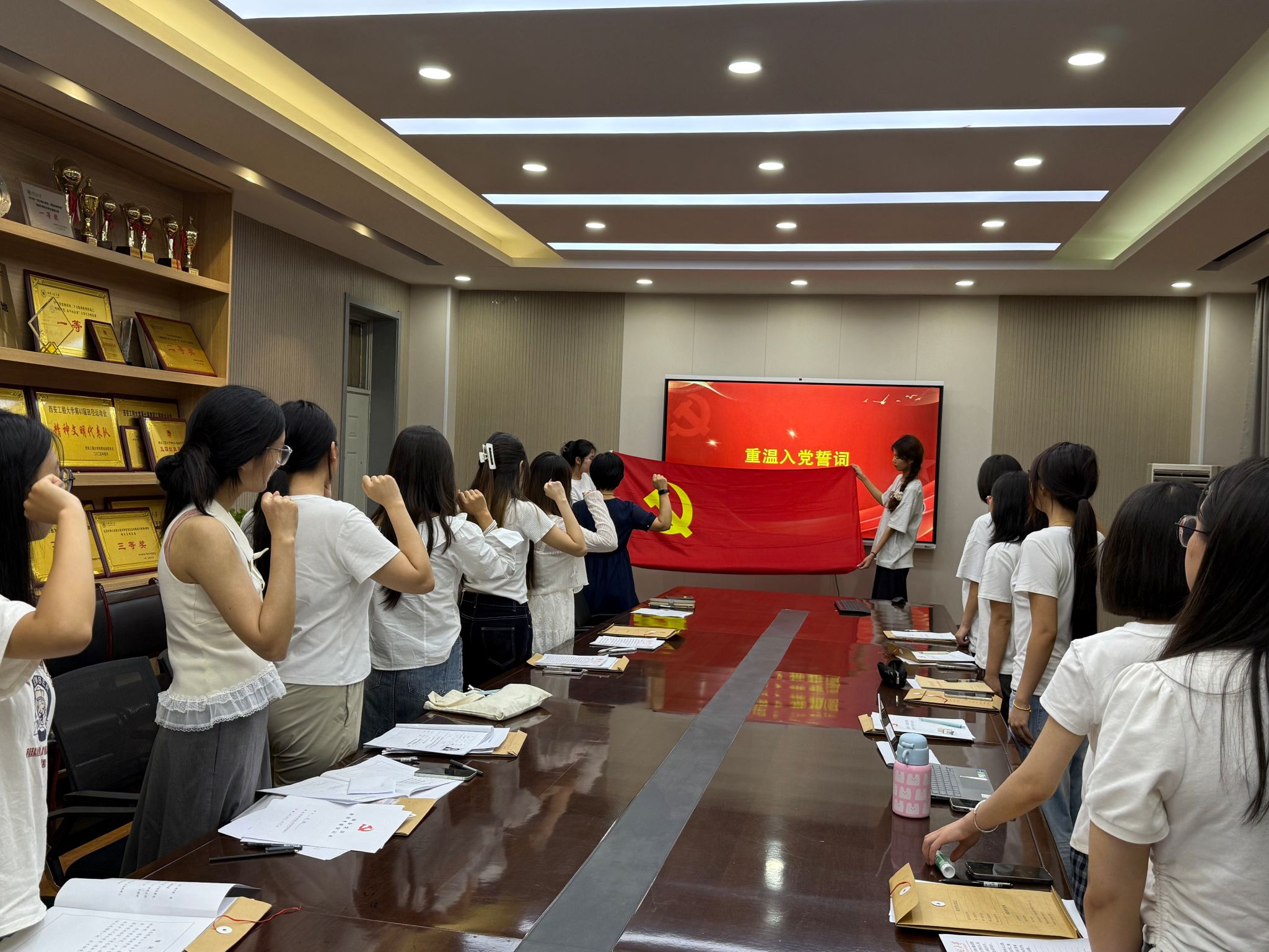 最后,支部向党员们发放了印有“心中有理想”字样的政治生日贺卡,传递组织的关怀与期望。在杜静书记领誓下,全体党员面向鲜红党旗,庄严重温入党誓词。铿锵誓言响彻会场,表达了子衿学子坚守初心、永跟党走的坚定信念,生动诠释了“赤诚子衿行”的实践内涵。